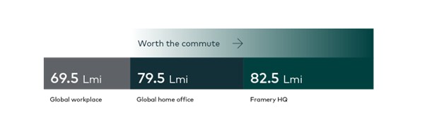 Leesman, der weltweit führende unabhängige Anbieter für Arbeitsplatzforschung, hat untersucht, wann sich der Weg ins Büro „tatsächlich lohnt“. Im Rahmen seiner unabhängigen Analysen zur Arbeitsplatzqualität erhebt Leesman, wie Mitarbeitende die Unterstützung ihres Arbeitsumfelds im Alltag wahrnehmen, und vergleicht diese Ergebnisse mit dem Leesman Index, einer globalen Datenbank mit über 1,5 Millionen Befragungen. Der weltweite Durchschnittswert für die Bewertung der Arbeitsumgebung im Büro (Lmi) liegt bei 69,5. Der Benchmark für das Arbeiten im Homeoffice (H-Lmi) liegt hingegen bei 79,5. Der Hauptsitz von Framery in Tampere erreicht einen Lmi-Wert von 82,5 und gehört damit zur weltweiten Spitzenklasse der Arbeitsplätze.