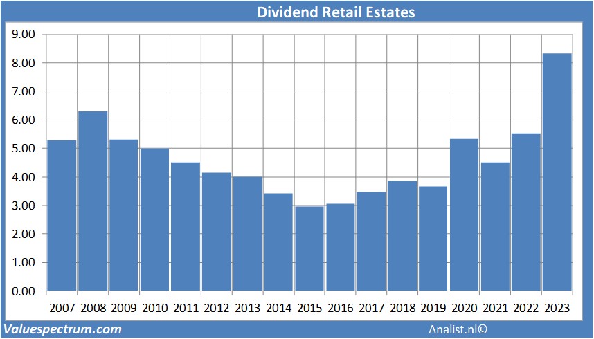 Es wird erwartet, dass der Schnitt der Dividenden 5.34 Euro betragen wird. Die Dividendenrendite beträgt folglich 8.33 Prozent. Die durchschnittliche Dividende des Immobiliengesellschaften beträgt eine relative hohe 5.34 Prozent.