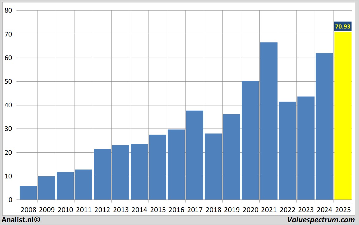 Es wird erwartet, dass der Schnitt der Dividenden 1.08 Dollar betragen wird. Die Dividendenrendite beträgt folglich 1.52 Prozent. Die durchschnittliche Dividende des Internetunternehmen beträgt eine relative hohe 2.14 Prozent.