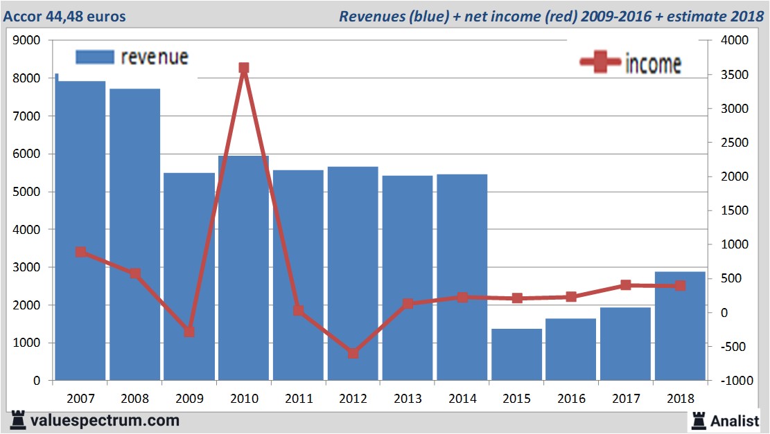 Accor wird morgen die Ergebnisse des letzten Quartals veröffentlichen. Für das aktuelle Geschäftsjahr wird von den Analysten ein Gesamtumsatz von 2,88 Mrd. Euro prognostiziert. Das ist viel mehr als der Ertrag im Jahr 2017 in Höhe von 1,94 Mrd. Euro.