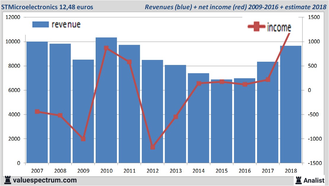 Morgen wird die französische STMicroelectronics die Resultate des letzten Quartals bekanntgeben. Für dieses Jahr beträgt der Konsensus des Umsatzes 9,66 Mrd. Euro. Das ist viel mehr als der Ertrag im Jahr 2017 in Höhe von 8,35 Mrd. Euro.