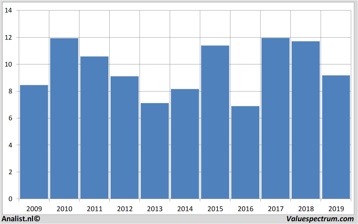 Anleger, die bereits im Jahr 2007 in Aktien des Unternehmens investierten, haben einen enormen Gewinn von 9 Prozent. Seit 2012 hat die Aktie einen Gewinn von 12 Prozent. In den vergangenen 90 Tagen hat die Aktie einen Verlust von 7 Prozent.Für dieses Jahr ist der Konsensus des Umsatzes 4,99 Mrd. Euro. Das ist etwas mehr als der Ertrag im Jahr 2017 in Höhe von 4,63 Mrd. Euro.