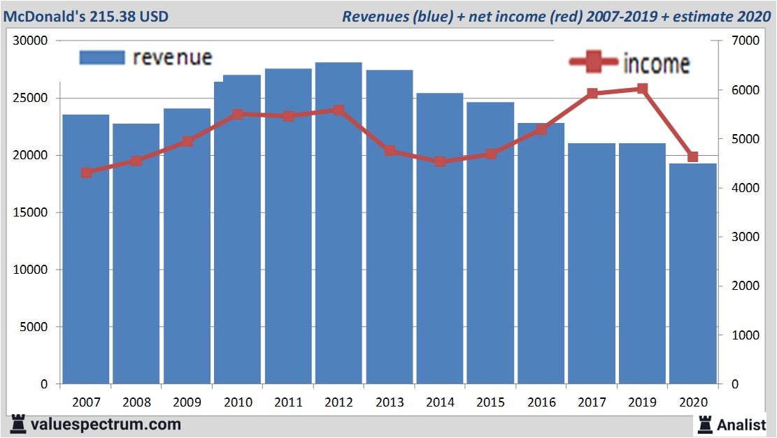 McDonald's Die Analysten erwarten für 2020 einen Jahresüberschuss von 4.63 Mrd. Dollar. Für dieses Jahr erwarten die meisten Analysten einen Gewinn je Aktie von 6.16 Dollar. Auf dieser Basis, liegt das Kurs-Gewinn-Verhältnis bei 34.96.