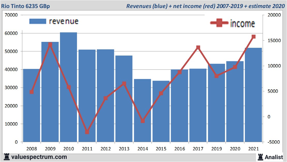 Historische Umsatzerlöse und Ergebnisse von Rio Tinto plus Schätzungen 2020