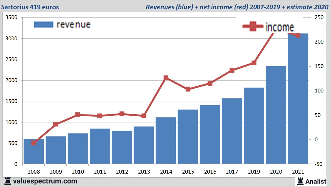 Sartorius wird Morgen die Ergebnisse des letzten Quartals veröffentlichen. Für das aktuelle Geschäftsjahr erwarten die Analysten einen Gesamtumsatz von 3.11 Mrd. Euro. Das ist viel mehr als der Ertrag im Jahr 2020 in Höhe von 2.34 Mrd. Euro.