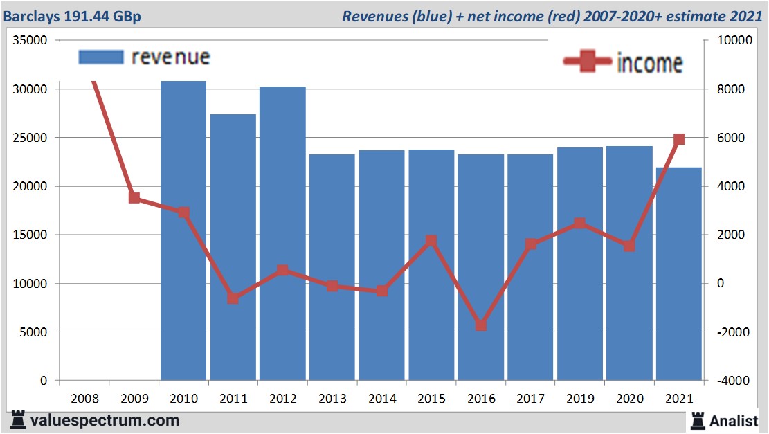 Morgen wird die englische Firma Barclays die Ergebnisse des vergangenen Quartals veröffentlichen. Für dieses Jahr ist der Konsensus des Umsatzes 21.9 Mrd. Britische Pfund. Das ist etwas weniger als der Ertrag im Jahr 2021 in Höhe von 24.14 Mrd. Britische Pfund.
