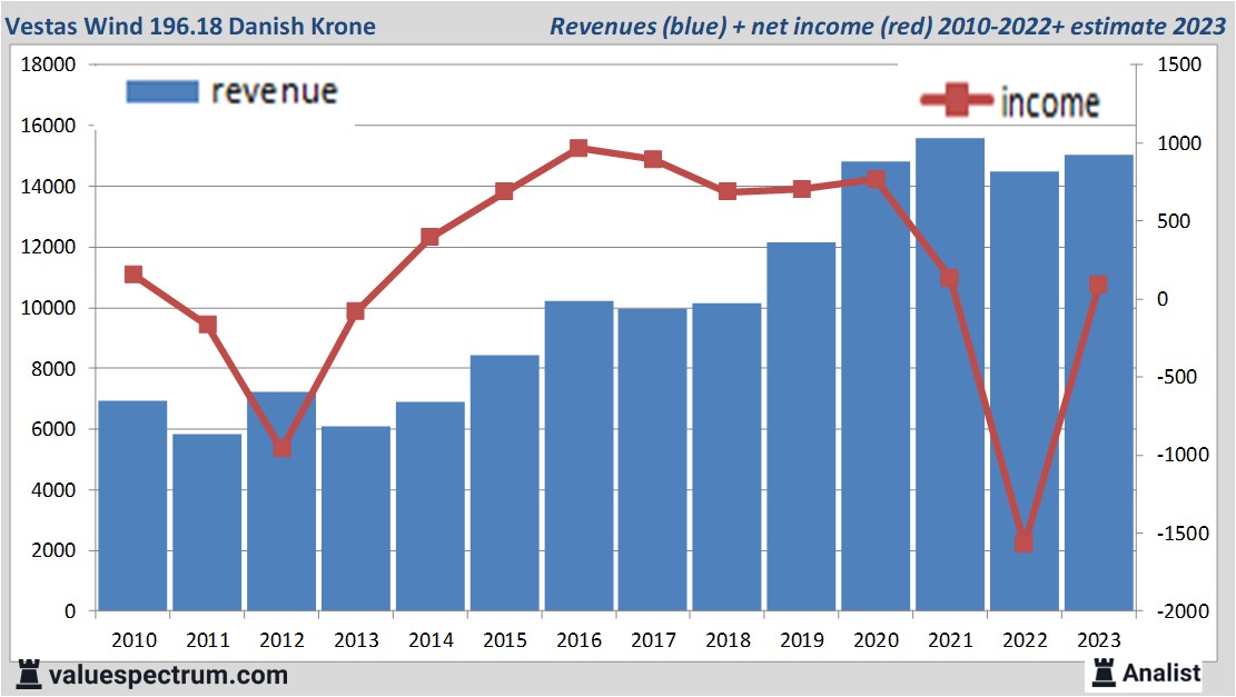 Morgen wird die dänische Firma Vestas Wind die Ergebnisse des letzten Quartals veröffentlichen. Für dieses Jahr ist der Konsensus des Umsatzes 15.02 Mrd. Dänische Krone. Das ist etwas mehr als der Ertrag im Jahr 2022 in Höhe von 14.49 Mrd. Dänische Krone.