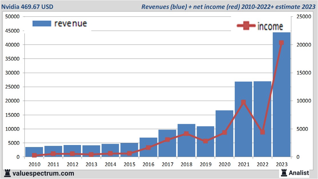 Morgen wird die amerikanische Nvidia die Ergebnisse des letzten Quartals veröffentlichen. Für dieses Jahr erwartet die Mehrheit der Analysten einen Gesamtumsatz 44.43 Mrd. Dollar. Sollten die Erwartungen über den Umsatz eintreffen, würde das einen Rekordumsatz für das Unternehmen bedeuten. Das ist viel mehr als der Ertrag im Jahr 2022 in Höhe von 26.97 Mrd. Dollar.